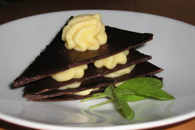 9. Kad su svi sastojci spremni, slagati sloj po sloj trokutić čokolade, pa kremu i pokriti sljedećim trokutićem čokolade.