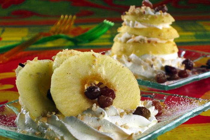 - Jabuke stavite u odgovarajuće zdjelice ili na tanjur, prelijte ih tekućinom s grožđicama u kojoj su se kuhale i pospite grubo nasjeckanim lješnjacima.