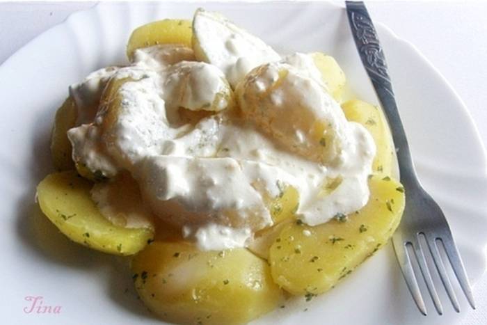 - krumpir ocijedimo i još toplog prelijemo malo sa maslinovim uljem, dodamo na sitno isjeckan peršin i pola od prženog bijelog luka.