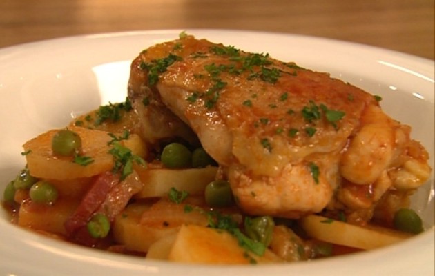 Na zagrijanom ulju ispecite piletinu narezanu na komade s jedne i druge strane. Meso izvadite, a na ulje dodajte nasjeckani luk i još pecite. Dodajte na kockice narezanu pancetu i protisnuti češnjak te zalijte prošekom i pasiranom rajčicom.