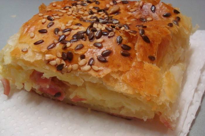 3. Razviti prvo lisnato tijesto skupa s papirom za pečenje, oko 2/3 tijesta po dužini premazati polovicom pripremljene smjese jaja i vrhnja, po tome naribati polovinu skuhanog krumpira pa sve skupa posuti nasjeckanom šunkom.