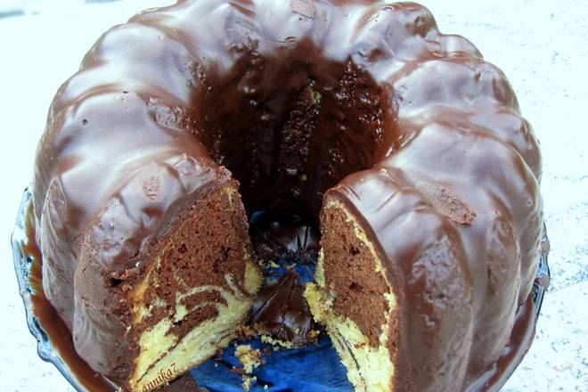 U namazan i brašnom posut kalup za kuglof lijevamo naizmjenice svjetlu i tamnu smjesu. Druga varijanta je da izlijete prvo svjetlu smjesu, pa u nju lijevajte tamnu i vilicom blago promiješajte da dobijete šare.
