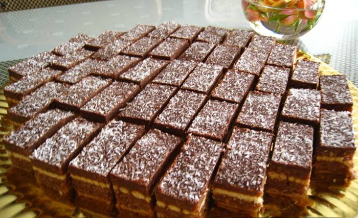Istopiti čokoladu sa uljem na tihoj vatri i preliti kolač, a zatim preko čokolade, dok se još nije stegla, posuti kokos.