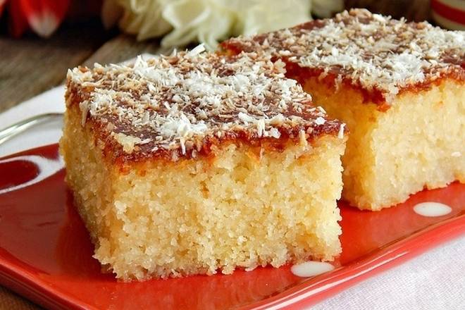 Hladan kolač izrezati na kocke, staviti ga u frižider da se dobro ohladi, po želji ga posuti kokosom i poslužiti.