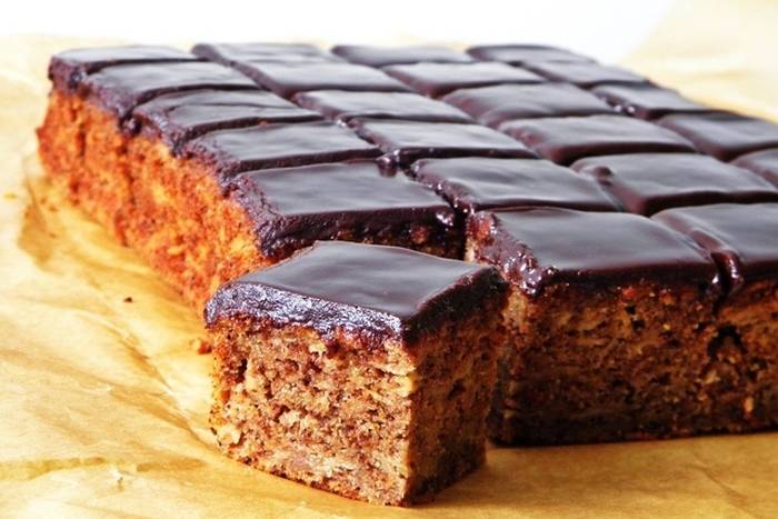 7. Vruć kolač preliti vrućom glazurom od čokolade, ohladiti i rezati na kocke (ili šnite, ako ste ga pekli u kalupu za kuglof).
