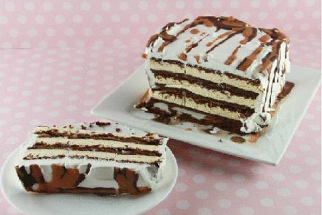 Posložite još jedan red keks sladoleda (možete tako složiti nekoliko katova), premažite šlagom, pospite mrvicama čokolade ili čokoladnim sirupom.