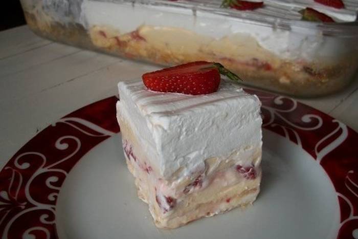 Koru premazati sa pola fila, preko staviti jagode koje isjeckate na kockice, na to stavite drugu polovinu fila.