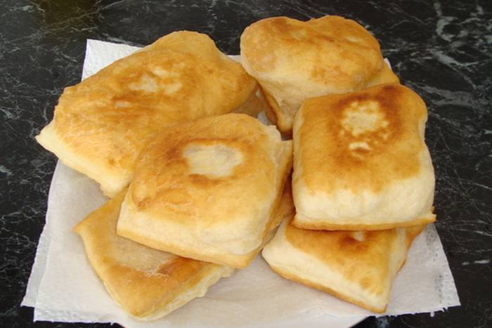 - Razviti valjkom na debljinu prsta, isjeći na pravokutnike i pržiti na vrućem ulju.