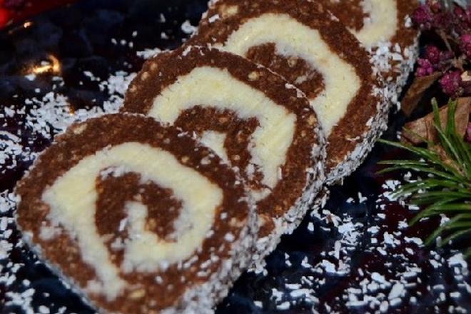 Celofan posuti sa kokosovim brašnom (onih drugih 50 grama iz popisa sastojaka!), staviti smjesu od keksa i razvući.