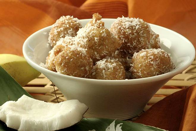 Posluživanje: Tople uštipke s bananama poslužite posute kokosovim brašnom.