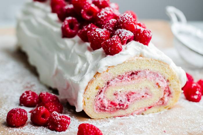Izvana rolat premažite preostalim filom i ukrasite malinama. (Ako želite da na njemu bude dosta malina, onda će vam trebati više od 200 g.)