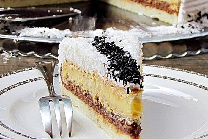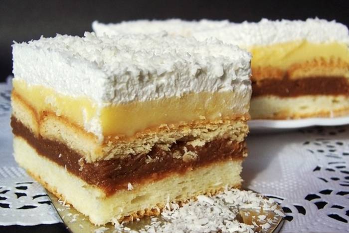 Slagati ovim redoslijedom: biskvit – crna krema – red petit keksa namočenih u mlijeko – žuta krema – šlag pjena. Na kraju kolač još posuti kokosom.