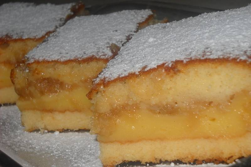 Onda pleh izvadite iz pećnice, pa preko njega premažite puding kremu (prvi fil), a preko kreme fil od jabuka. Sve to prekrijte ostatkom smjese pa vratite u pećnicu još 15-ak minuta, da se ispeče do kraja.