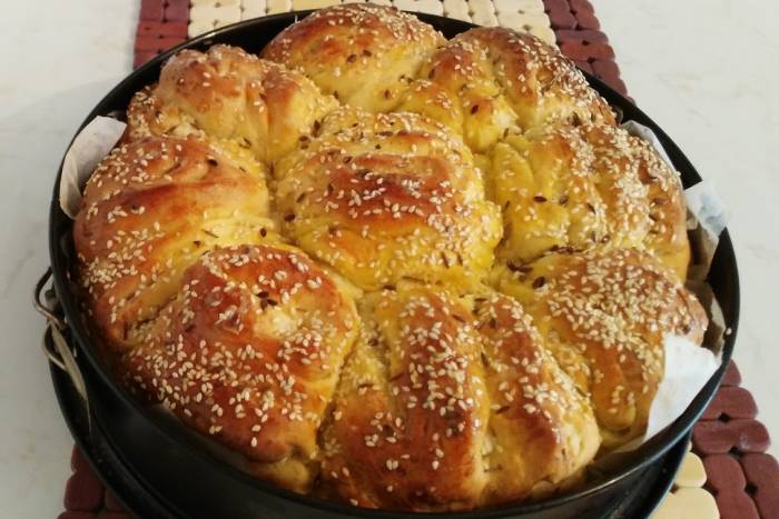 Pogaču namazati jajetom sa malo ulja i posuti sjemekama…