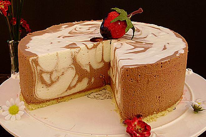 Na biskvit koji ste ostavili u kalupu da se ohladi ulijte tamnu čokoladu i prošarajte bijelom. Stavite u hladnjak (najbolje preko noći, možete čak i jedno sat vremena u zamrzivač, pa preseliti u hladnjak).