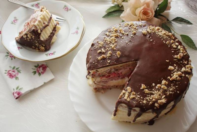 2. Tortu ostavite u hladnjaku da se ohladi i stegne, a zatim prelijte čokoladom otopljenom s uljem i posipajte mljevenim lješnjacima.