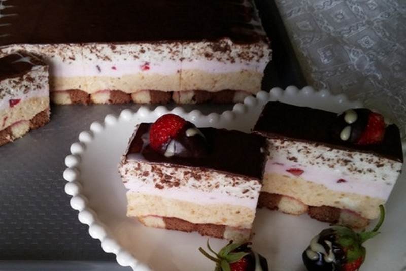 U pleh dimenzija 36×24 cm staviti foliju, preko folije sipati prvi dio, pa drugi dio, pa treći dio. Zatim preko posljednjeg dijela poređati piškote koje su provučene kroz sok od jagoda.
