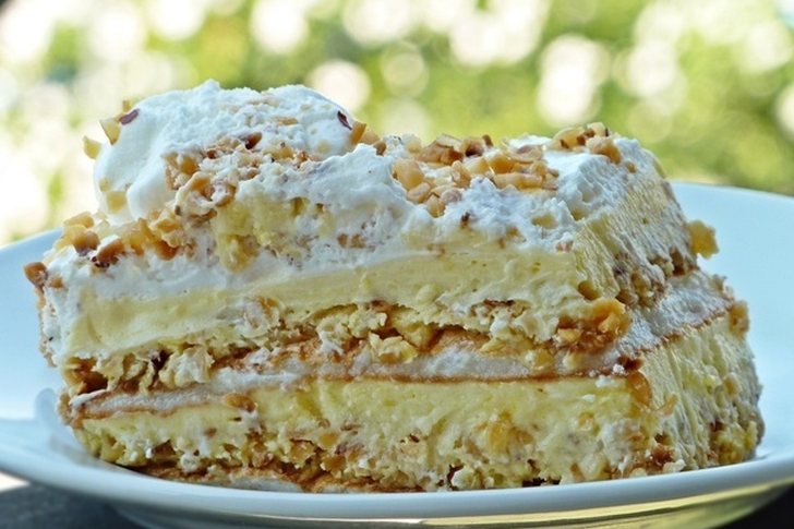 Na kraju sve premazati umućenim šlagom i posuti krupno rezanim orasima.