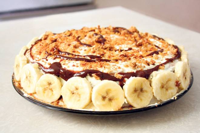 Stavite prvu koru, pa banane izrezane na kolutiće, pola fila, drugu koru, pa ostatak fila.