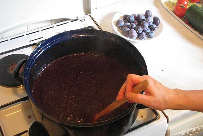 Za ovu količinu šljiva i šećera džem treba kuhati otprilike 2,5 sata uz stalno miješanje, pogotovu pred kraj.